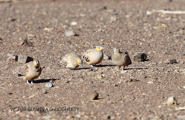 Desde nuestra izquierda se van acercando lentamente en grupo un buen número de Gangas Coronadas " Pterocles coronatus".